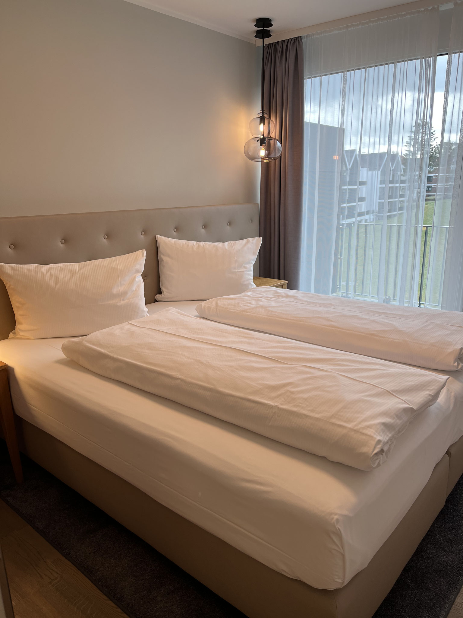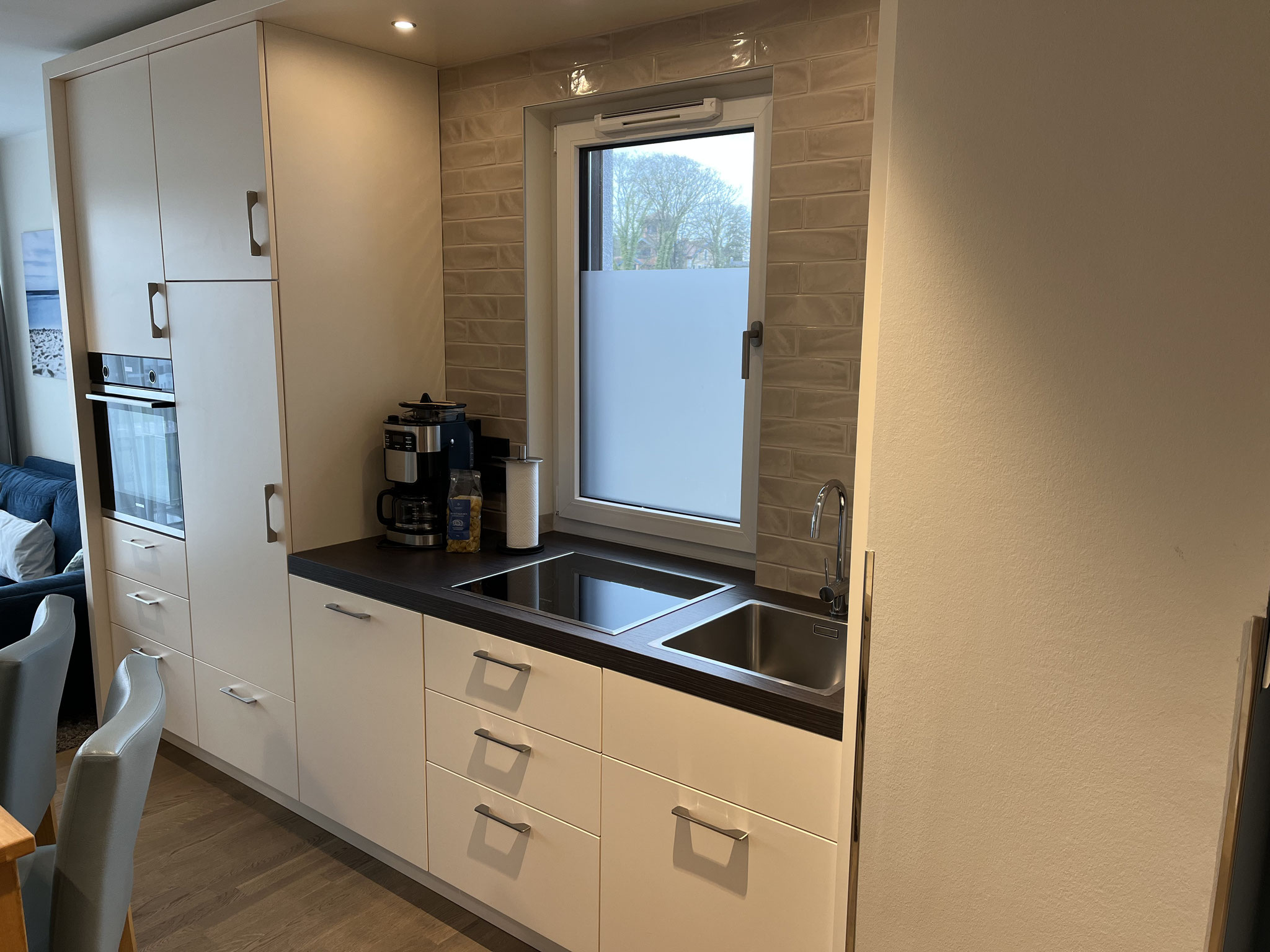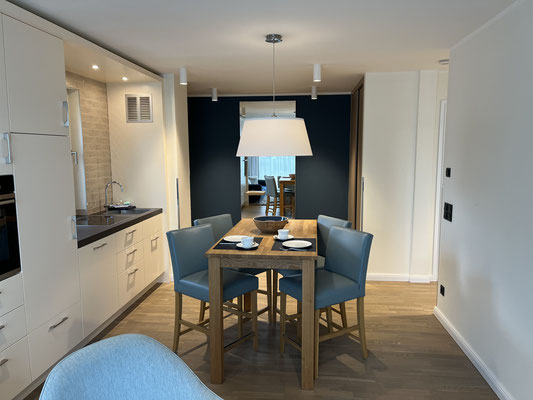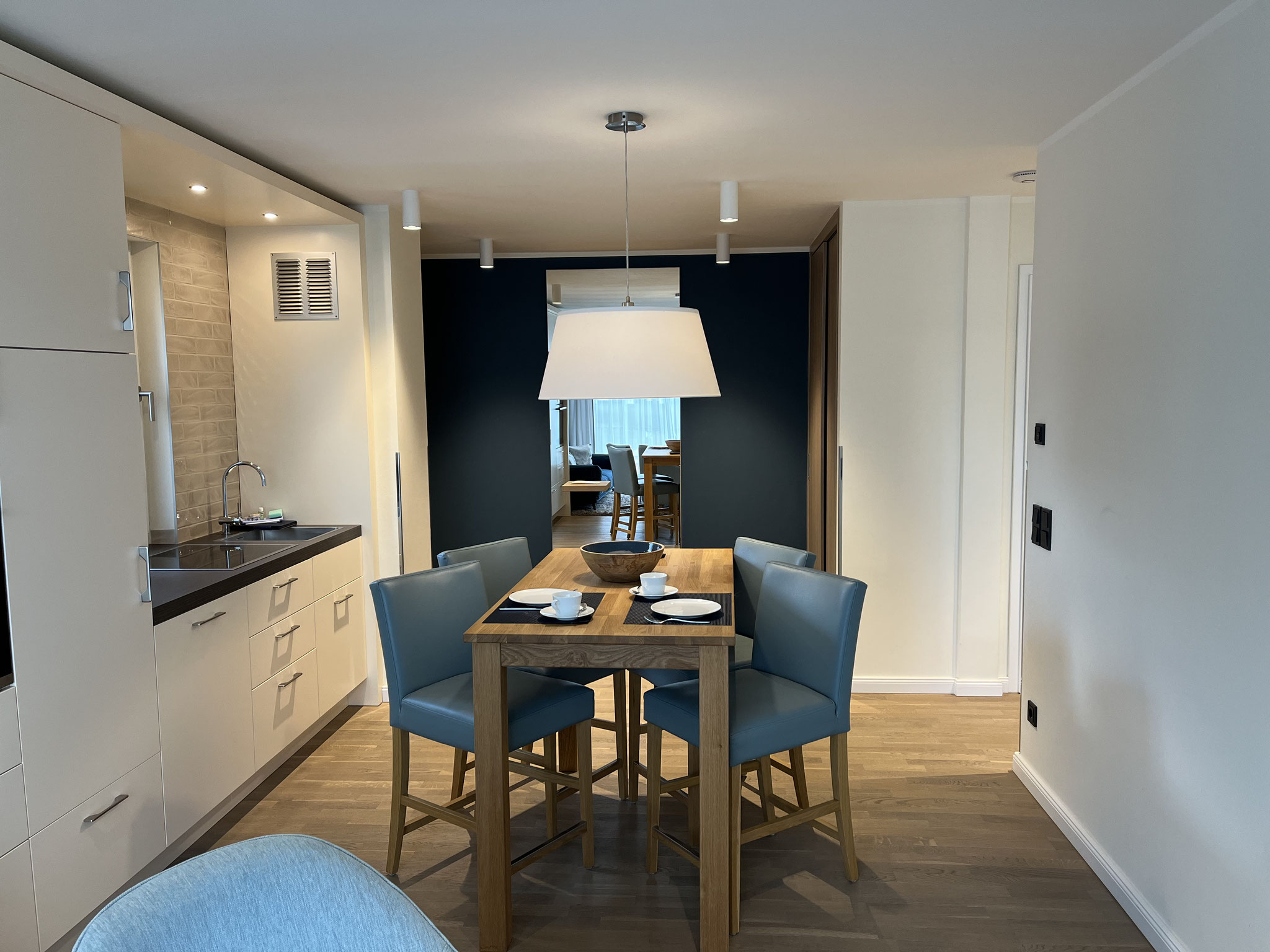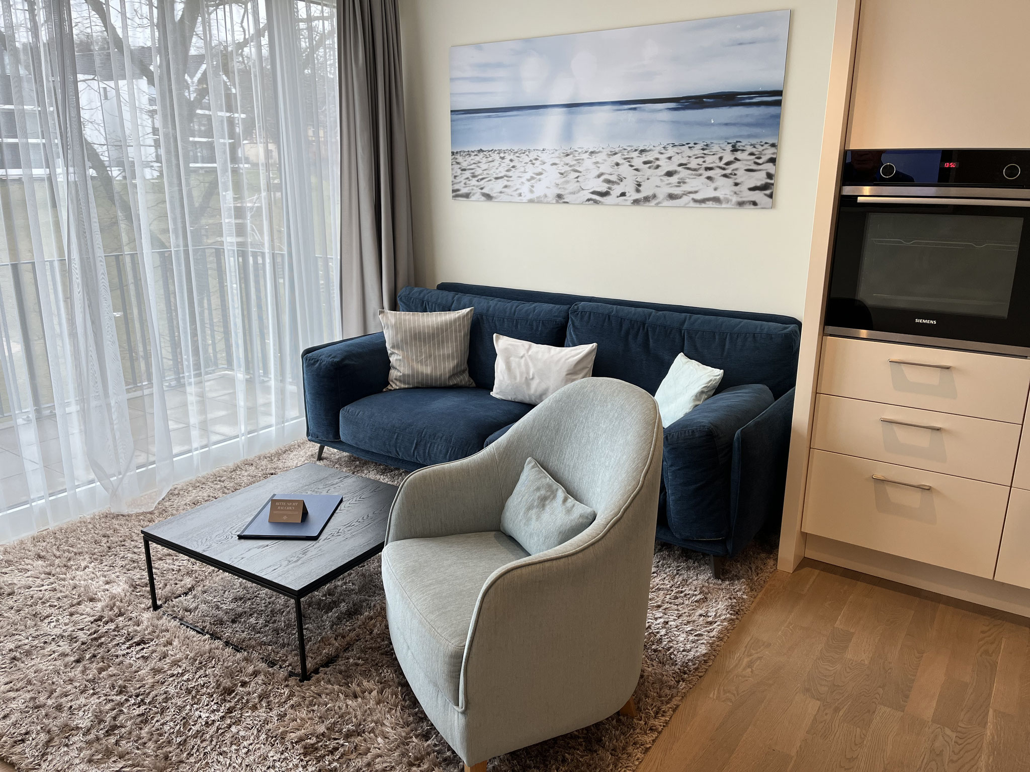 Insgesamt ist das Appartement auf hohem Niveau stilvoll eingerichtet. Zusätzlich bietet es Ihnen neben dem offenen Wohnbereich mit Sofa und Sessel, eine Küchenzeile mit Esstisch für 4